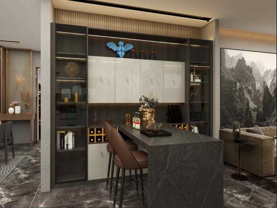 如果是酒吧的酒柜,通常分兩個部分,一部分是底柜,高度通常在60左右,厚度50左右。上柜則高度不超過2米,厚度不超過35.酒柜和吧臺之間的距離通常要應該在90厘米以上。